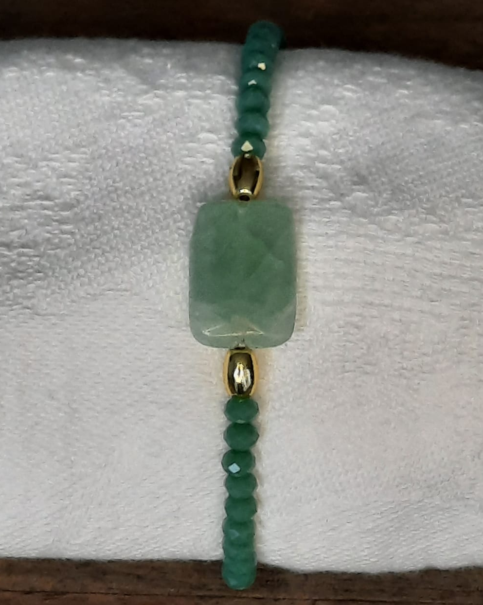 Geraffineerd kleurenspel van mooie materialen. Zeegroene kralen, gecombineerd met groene Agaat. Lengte 18 cm.