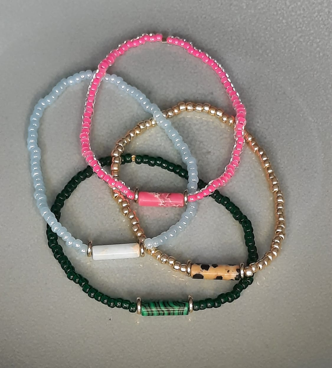Armband op elastiek met diameter 17 cm. Verkrijgbaar in diverse zomerse kleuren en met verschillende rijke materialen afgewerkt. Natuurlijk ook prachtig om bij elkaar te dragen.
