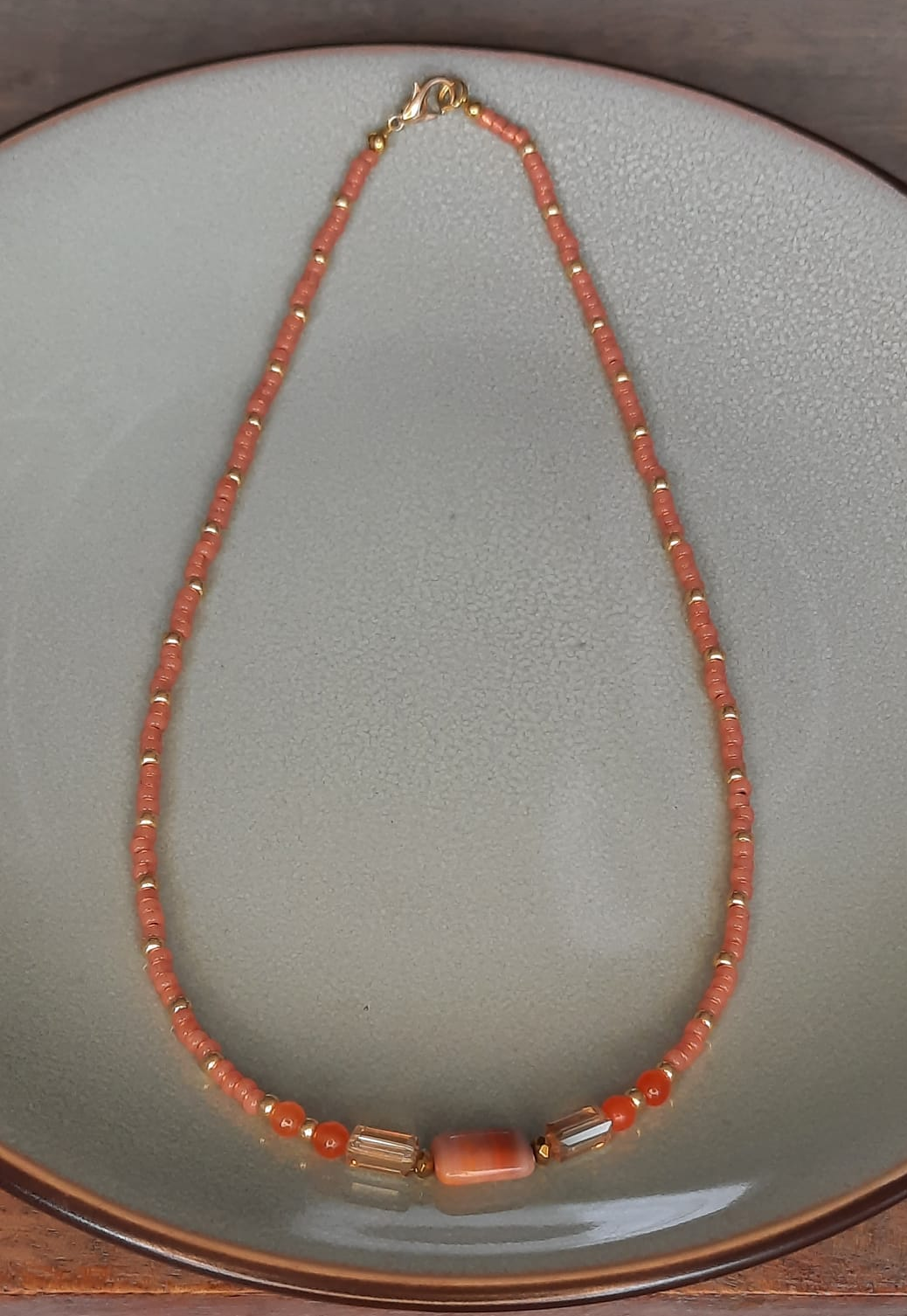 Kettting van glaskralen in een zachte abrikooskleur, gecombineerd met carneool