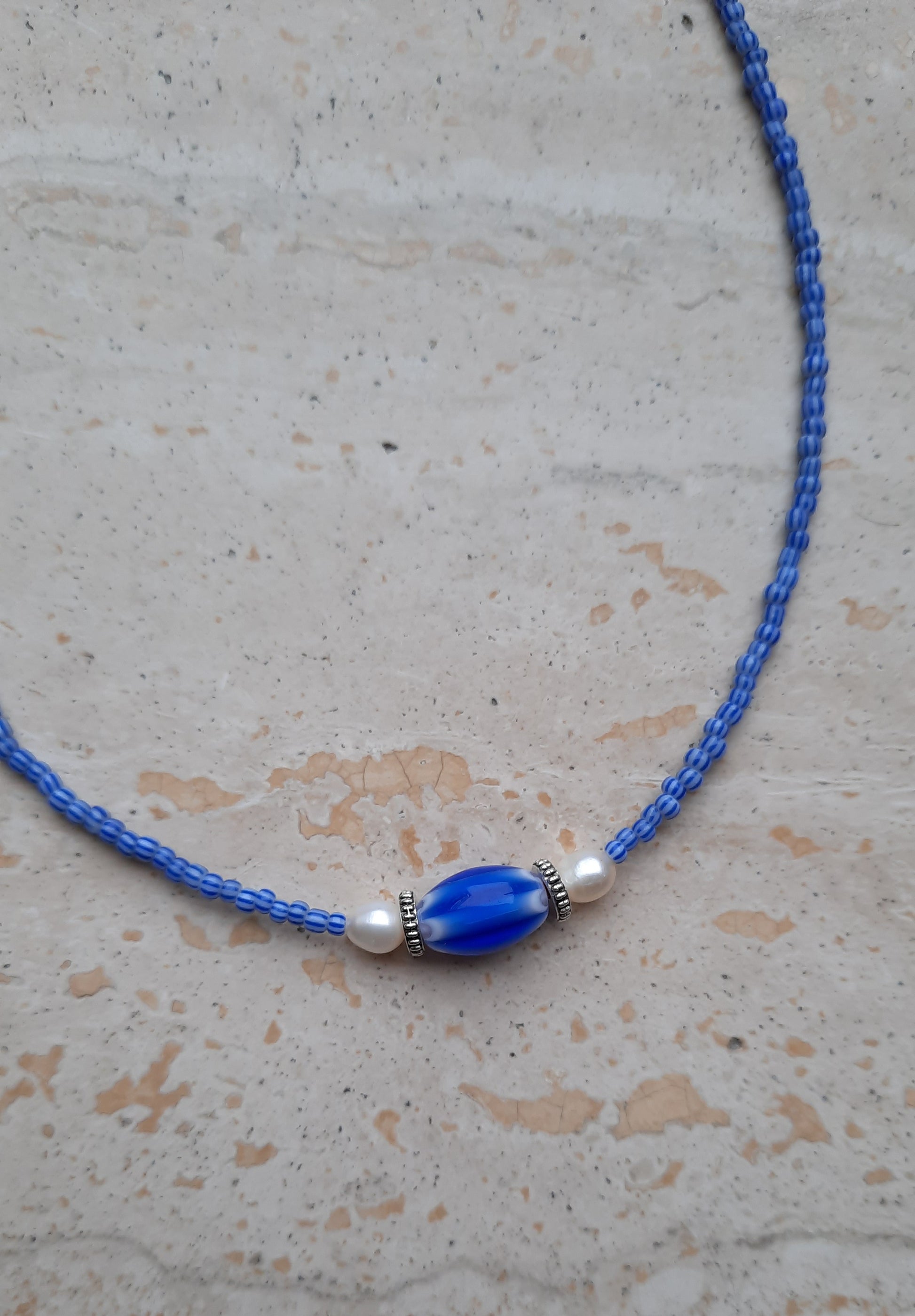 Ketting gemaakt van blauwe kralen, voorzien van sluiting. Standaard halslengte is 42 cm, andere afmetingen kunnen op verzoek gemaakt worden.
