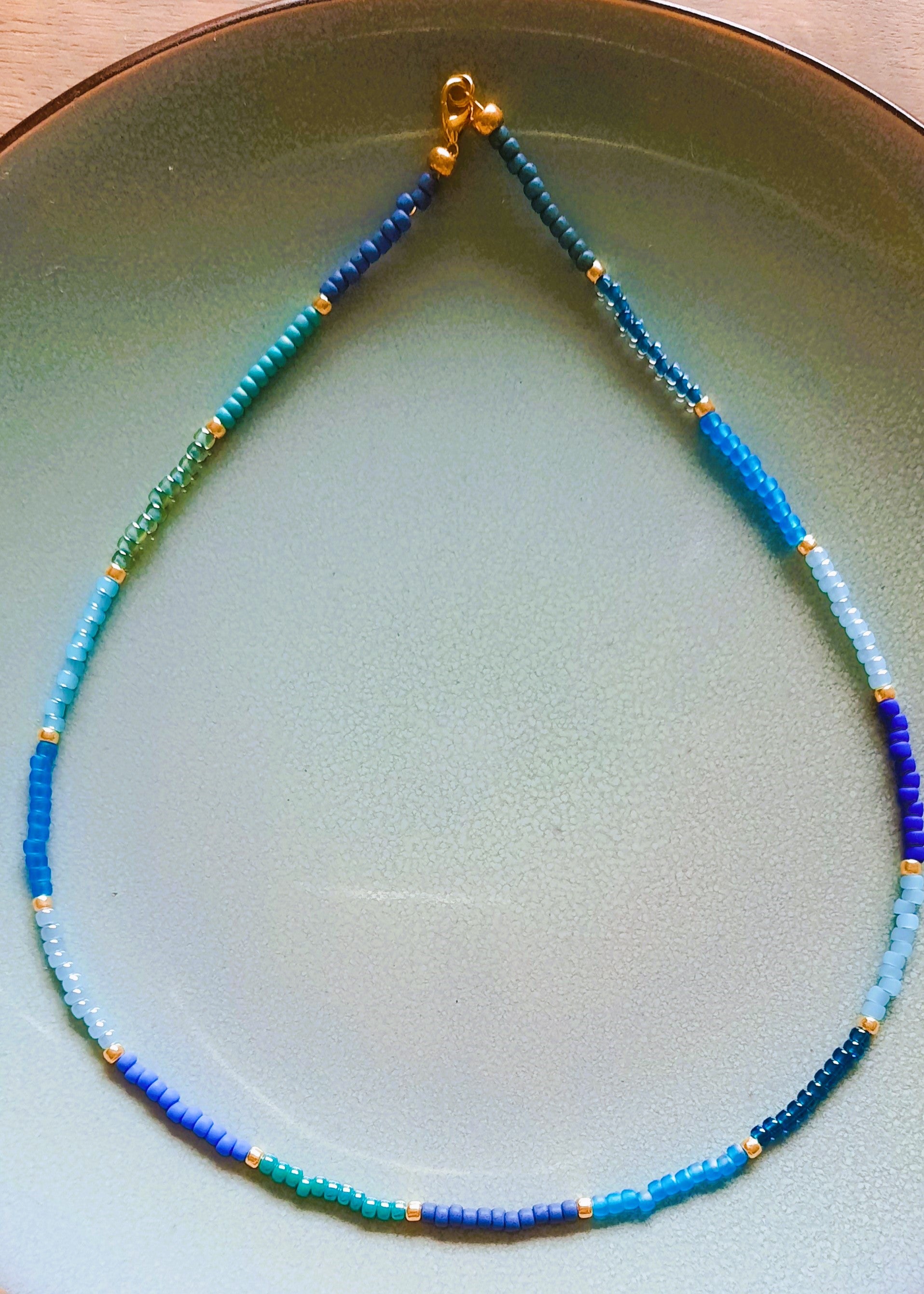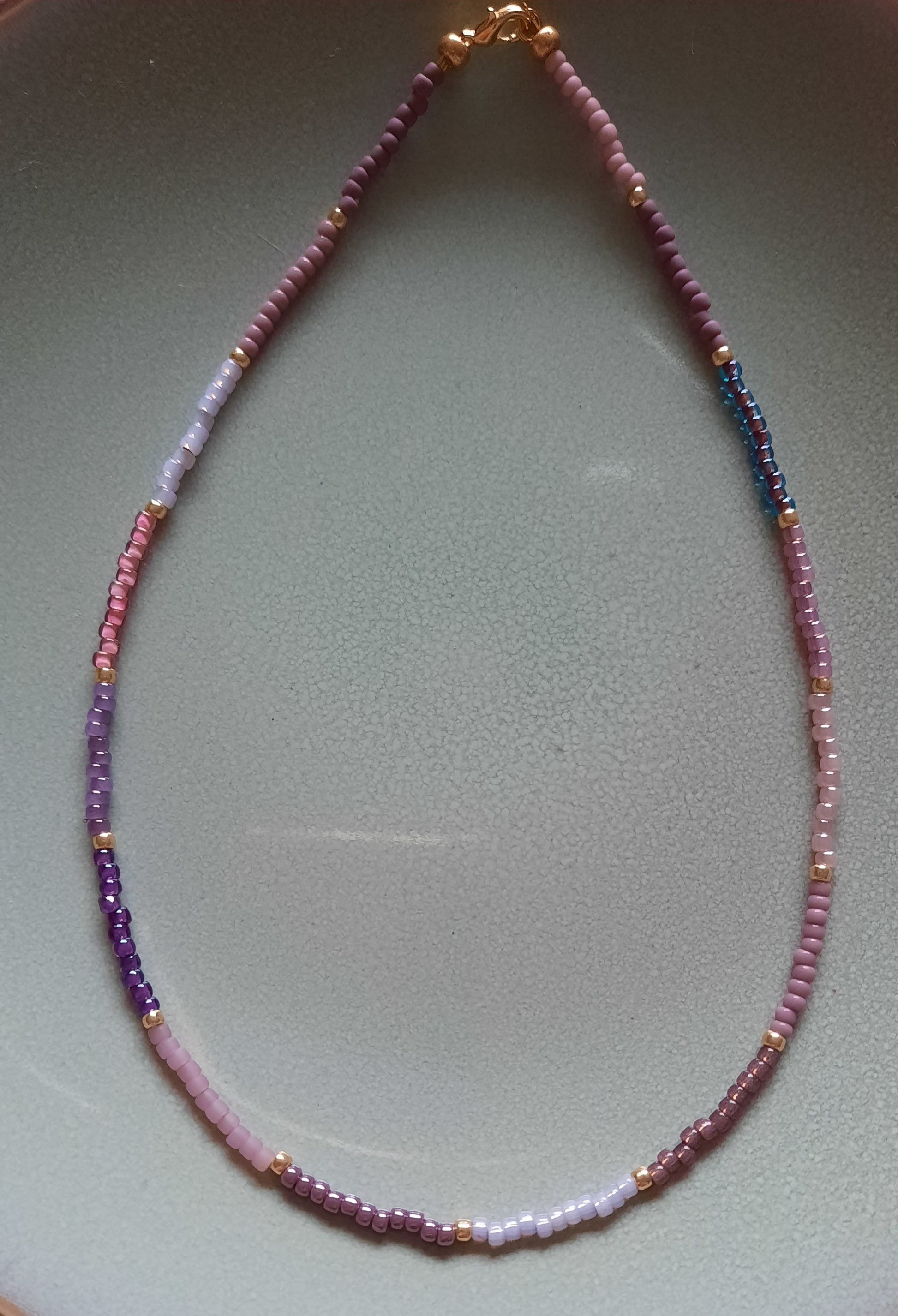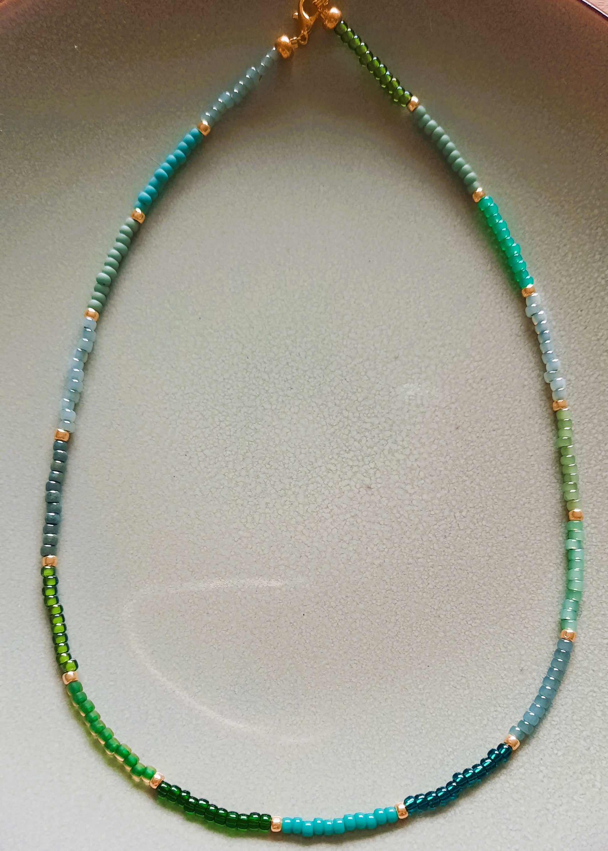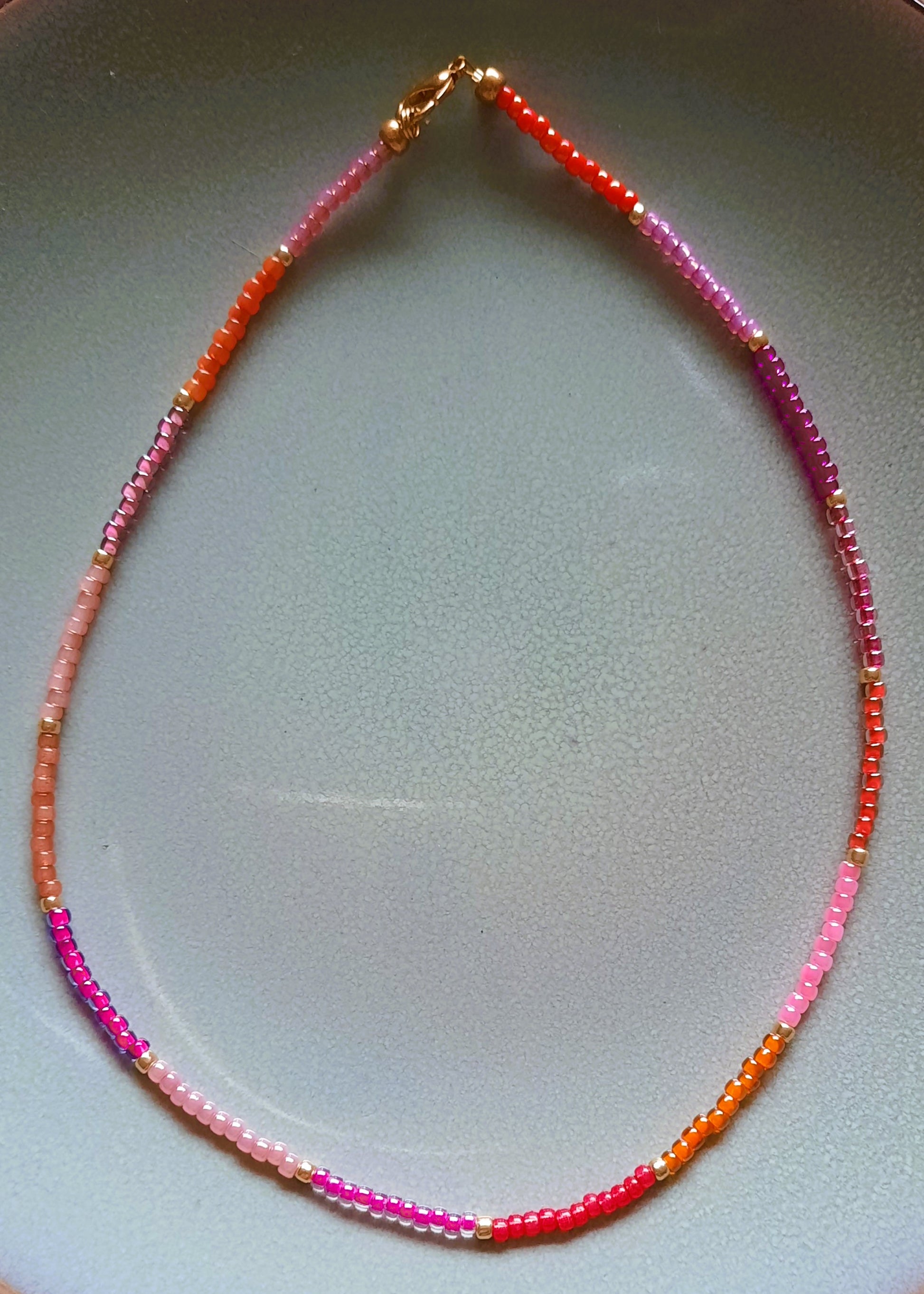 Deze ketting is gemaakt van rocailles en in diverse kleuren verkrijgbaar. De standaard halsmaat is 42 cm, andere lengtes kunnen op verzoek gemaakt worden.