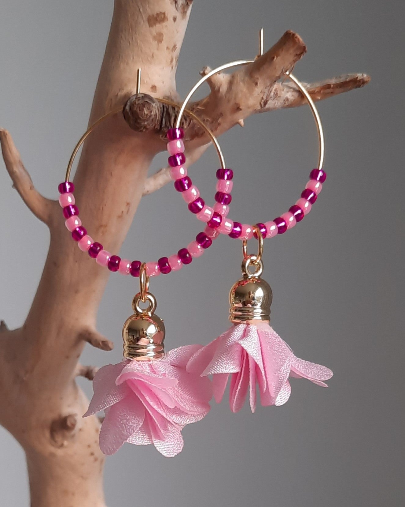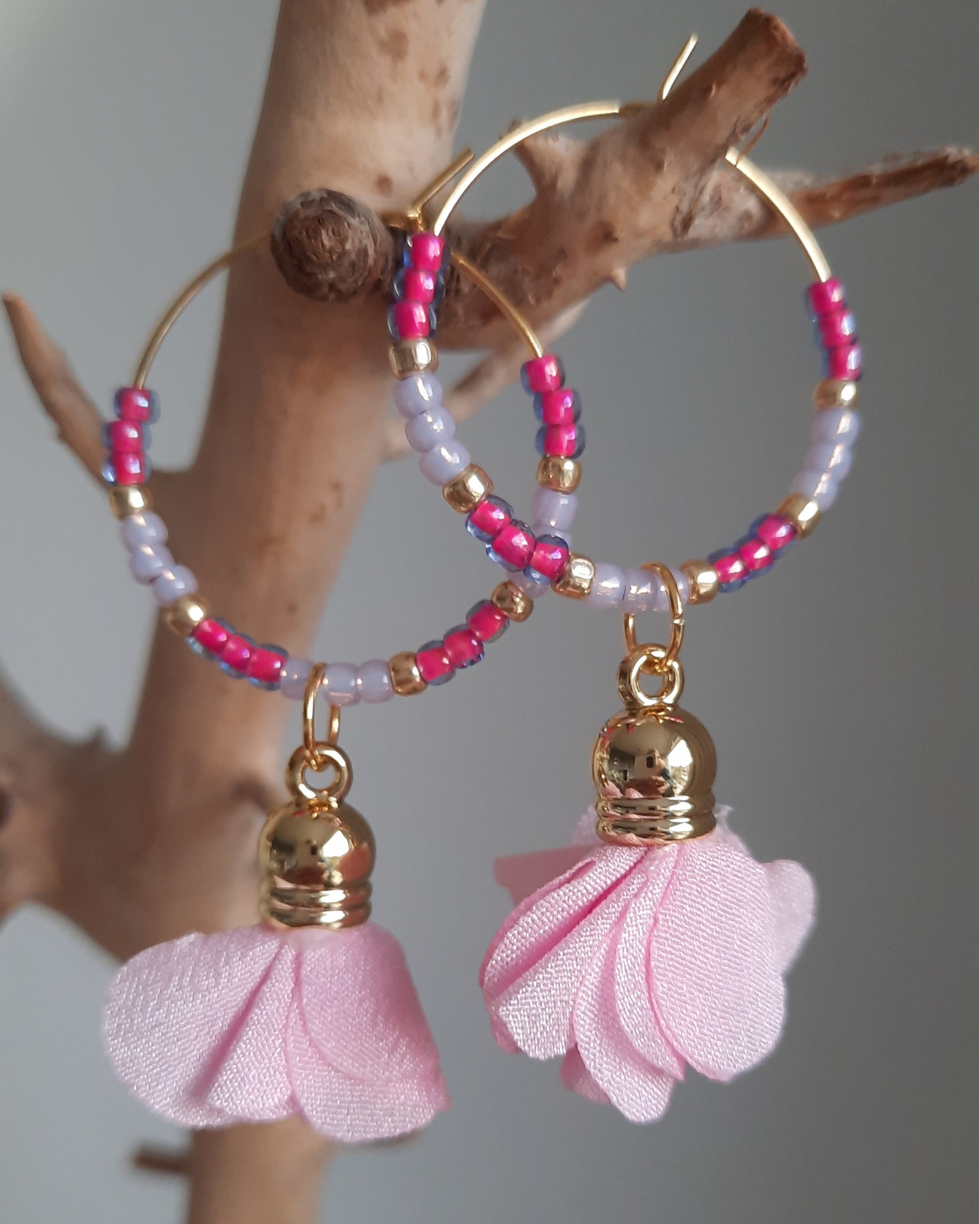 Goudkleurige loops met roze, lila en gouden kraaltjes. Verkrijgbaar in een uitvoering met twee kleuren en een variant met meerdere kleuren.